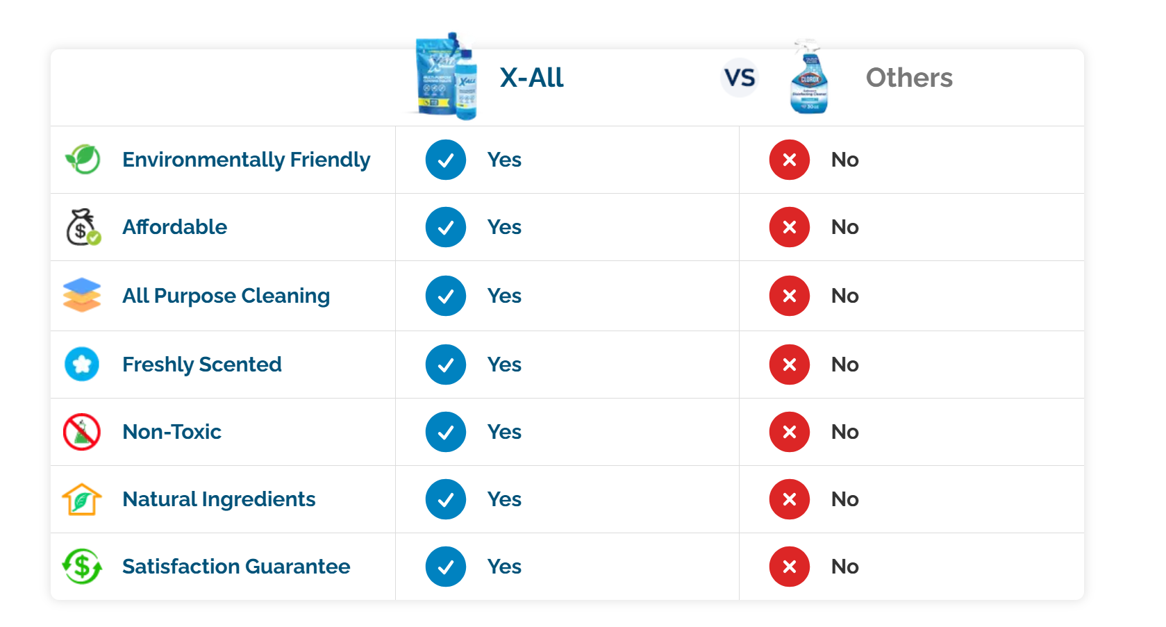 “I used to buy five different cleaning products for different rooms, now I just use X-All for everything. It’s easy, effective, and I actually enjoy cleaning again!”